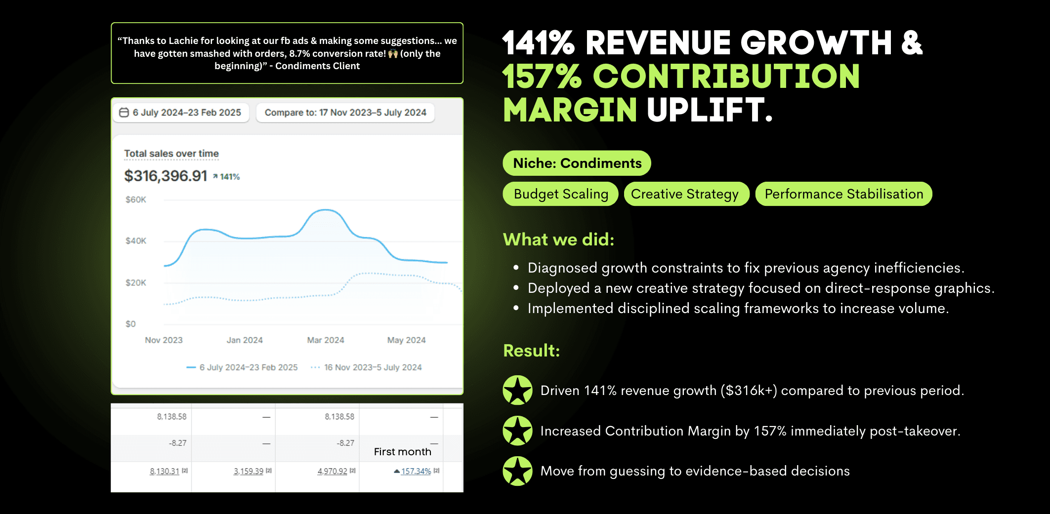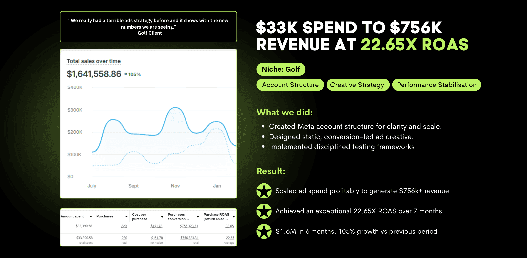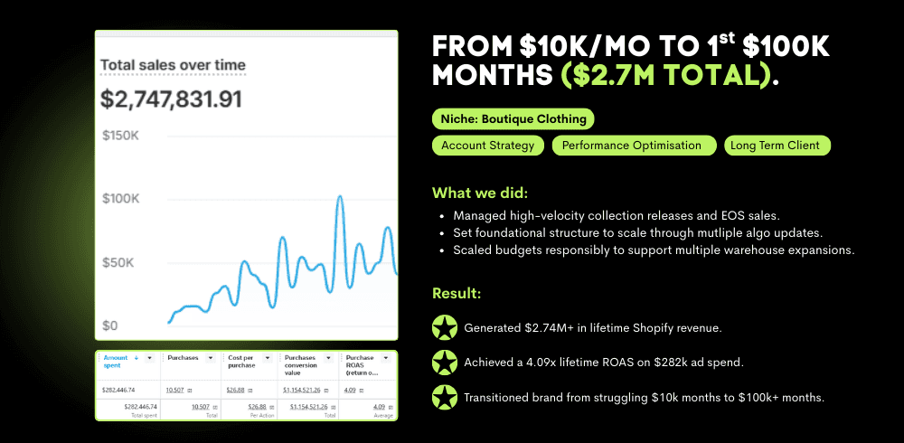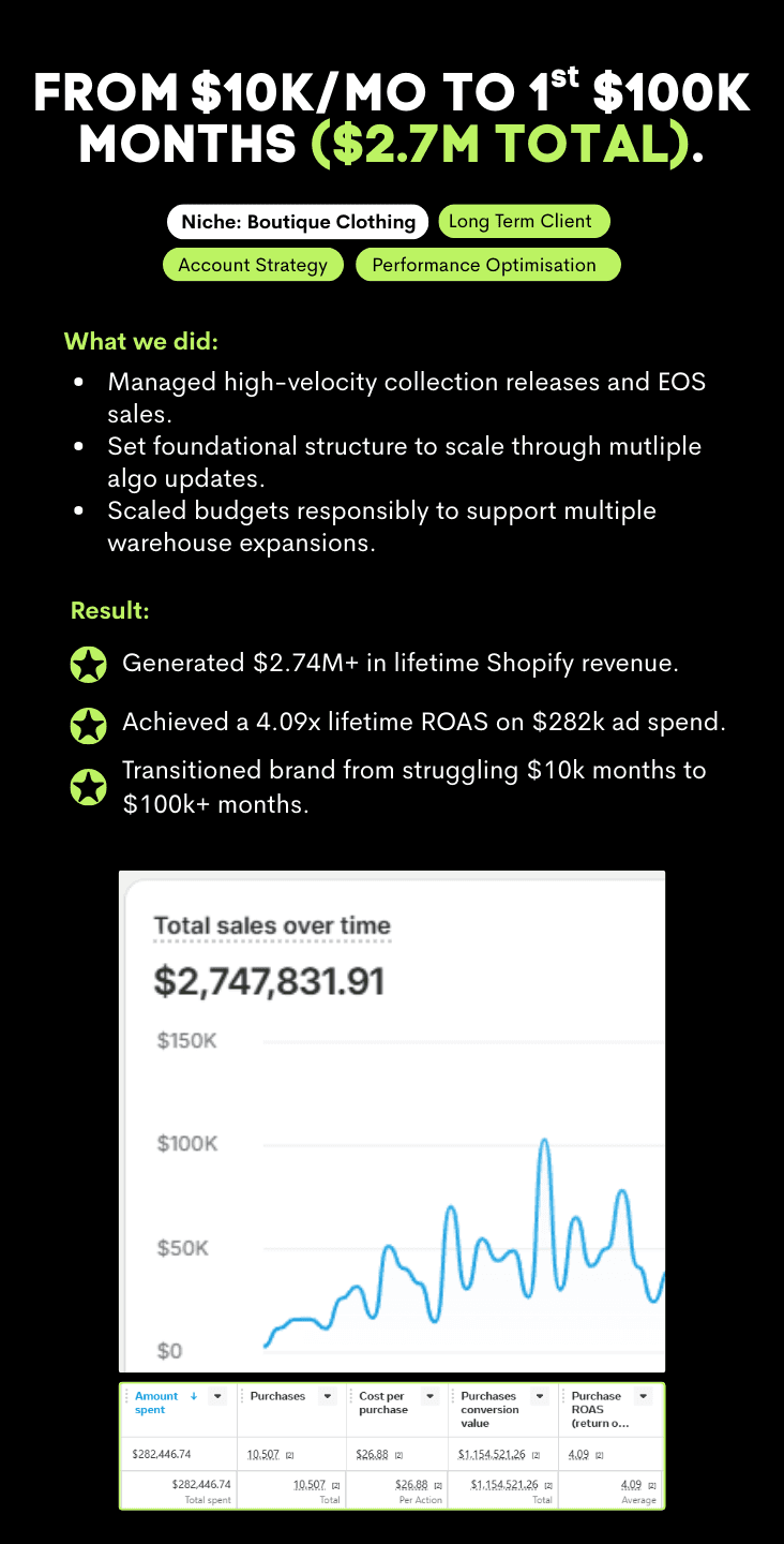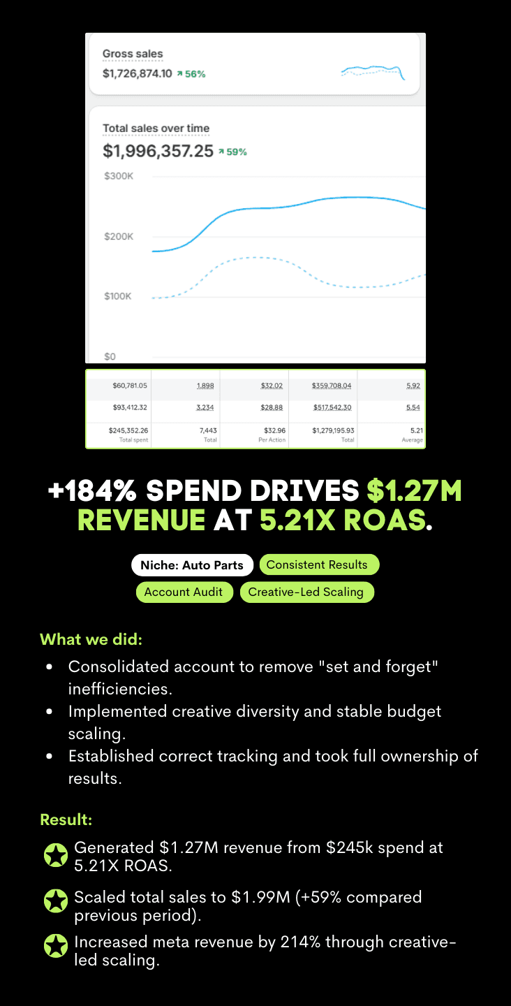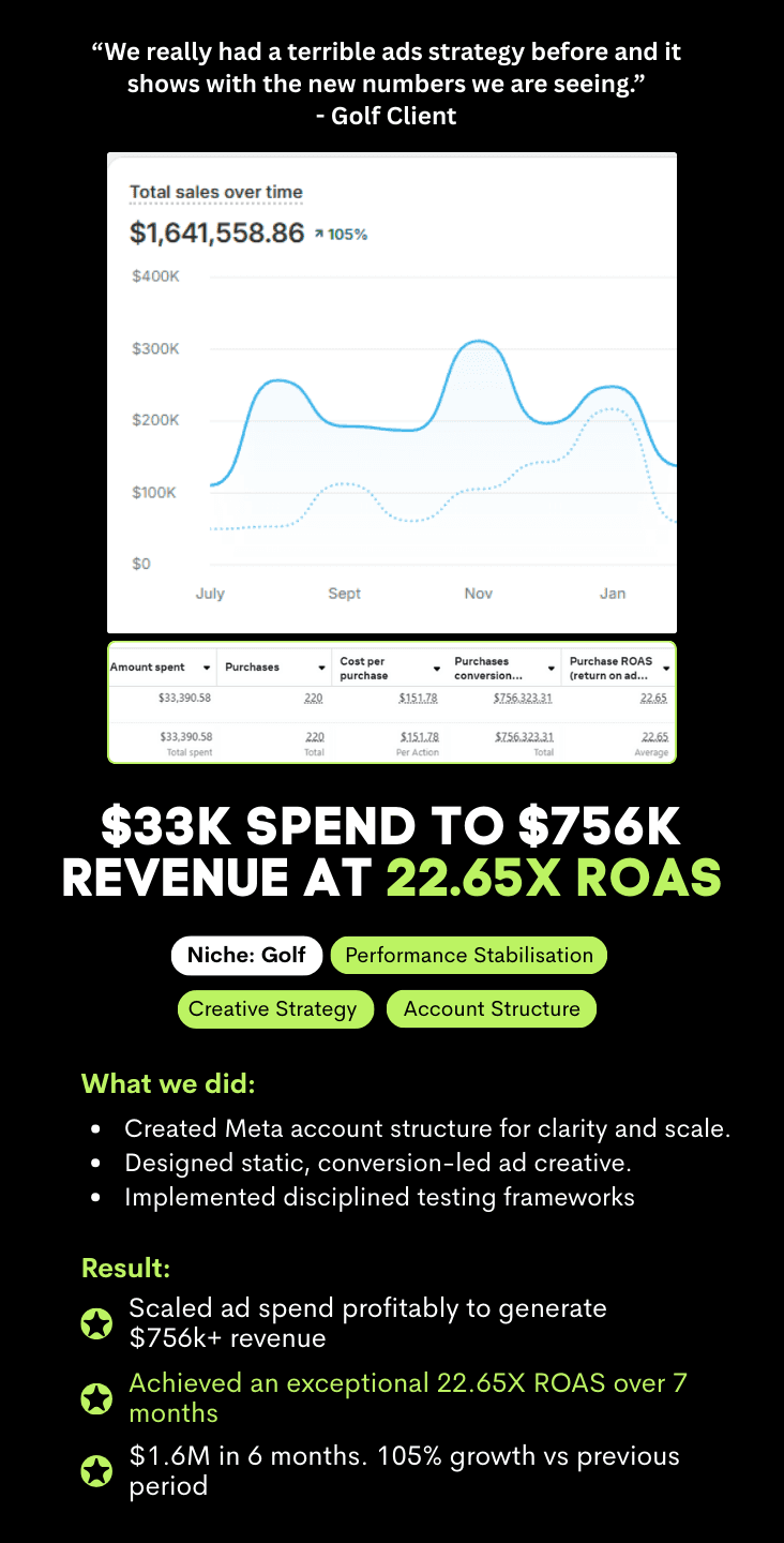 See how we have helped Shopify brands scale through disciplined ad management, intelligent strategy, and diverse creative testing. Real accounts. Real decisions. Real outcomes.